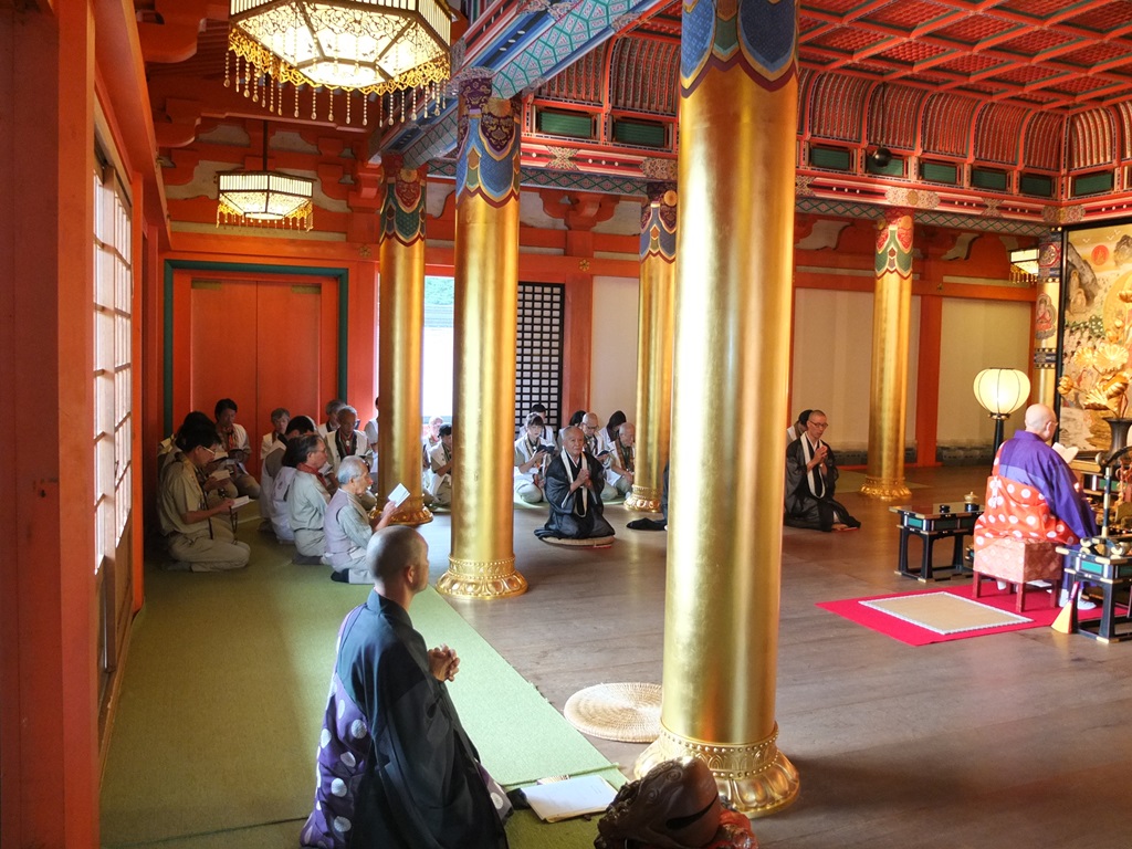 スカウト法要では、寺本理事長導師のもと参加者全員でスカウトの『ちかい』、『おきて』等を唱和の後、天台スカウトハンドブックの「家庭勤行次第」に従い、慈覚大師を偲ぶ法要を進めました。