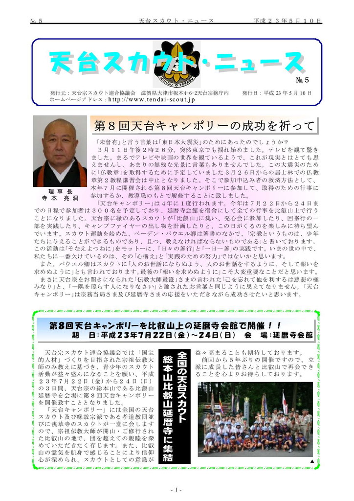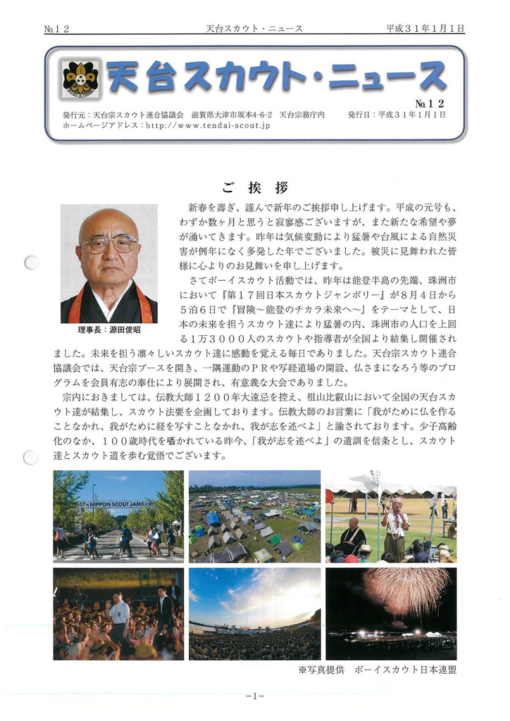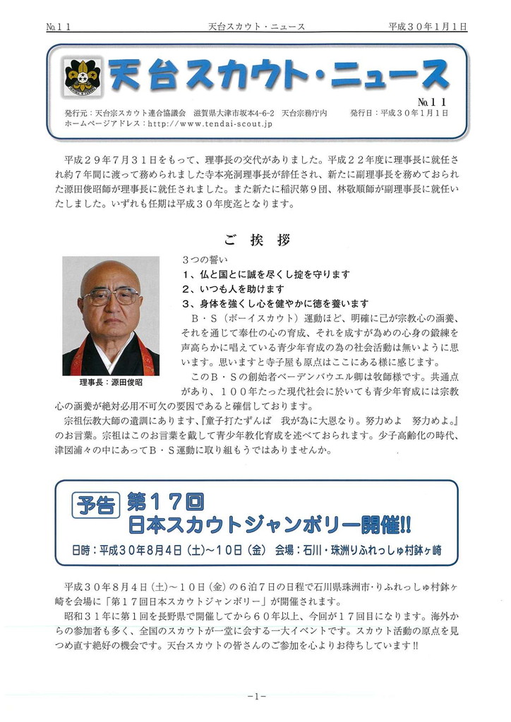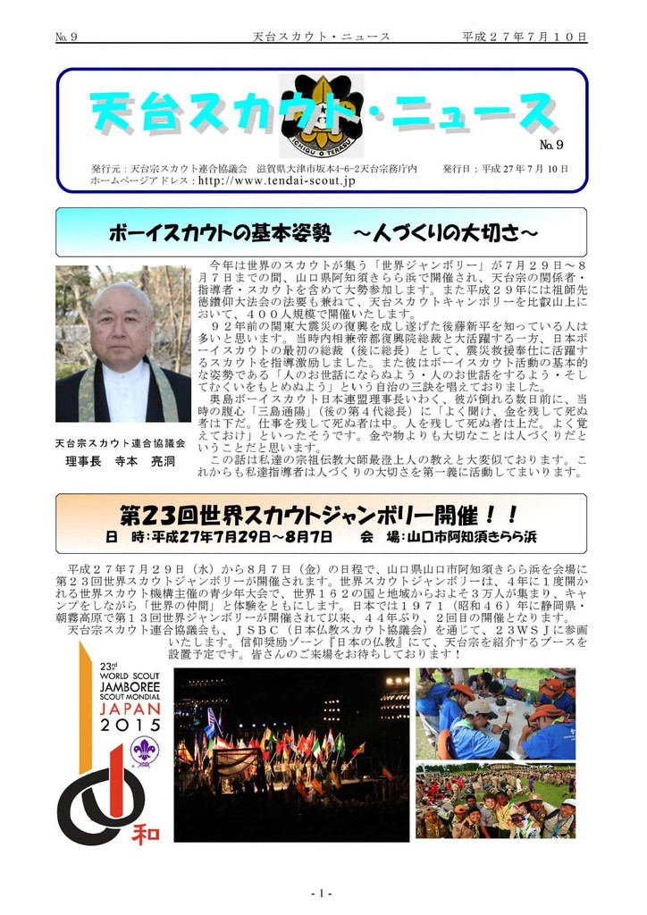 第10回天台キャンポリー、第25回世界スカウトジャンボリー等の報告、ボーイスカウト加古川第2団の紹介。