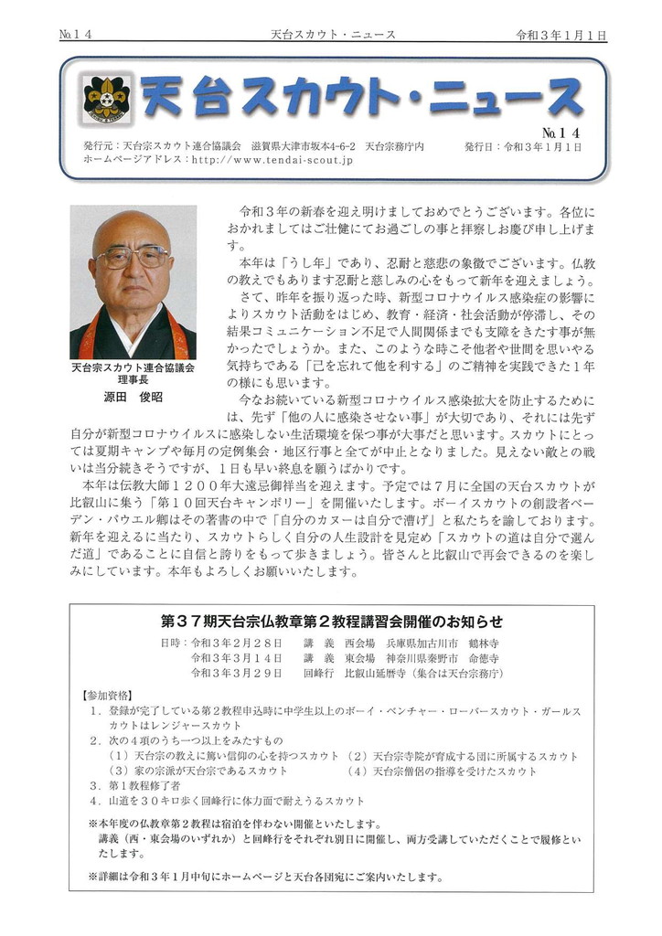 第35期仏教章講習会とボーイスカウト講習会の記事掲載。