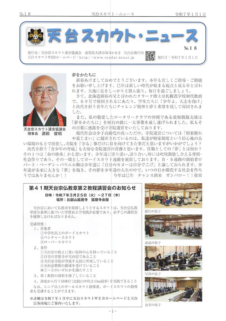 第41期天台宗仏教章講習会の告知とガールスカウト東京都150団の紹介。