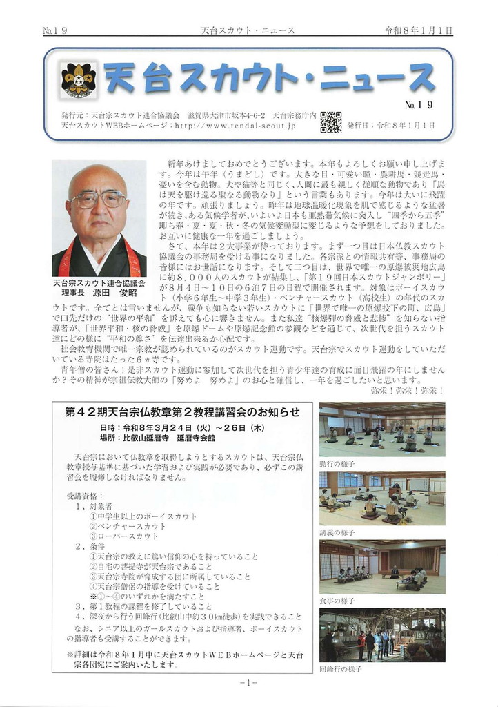 第42期天台宗仏教章講習会の告知とガールスカウト滋賀県第5団の紹介。